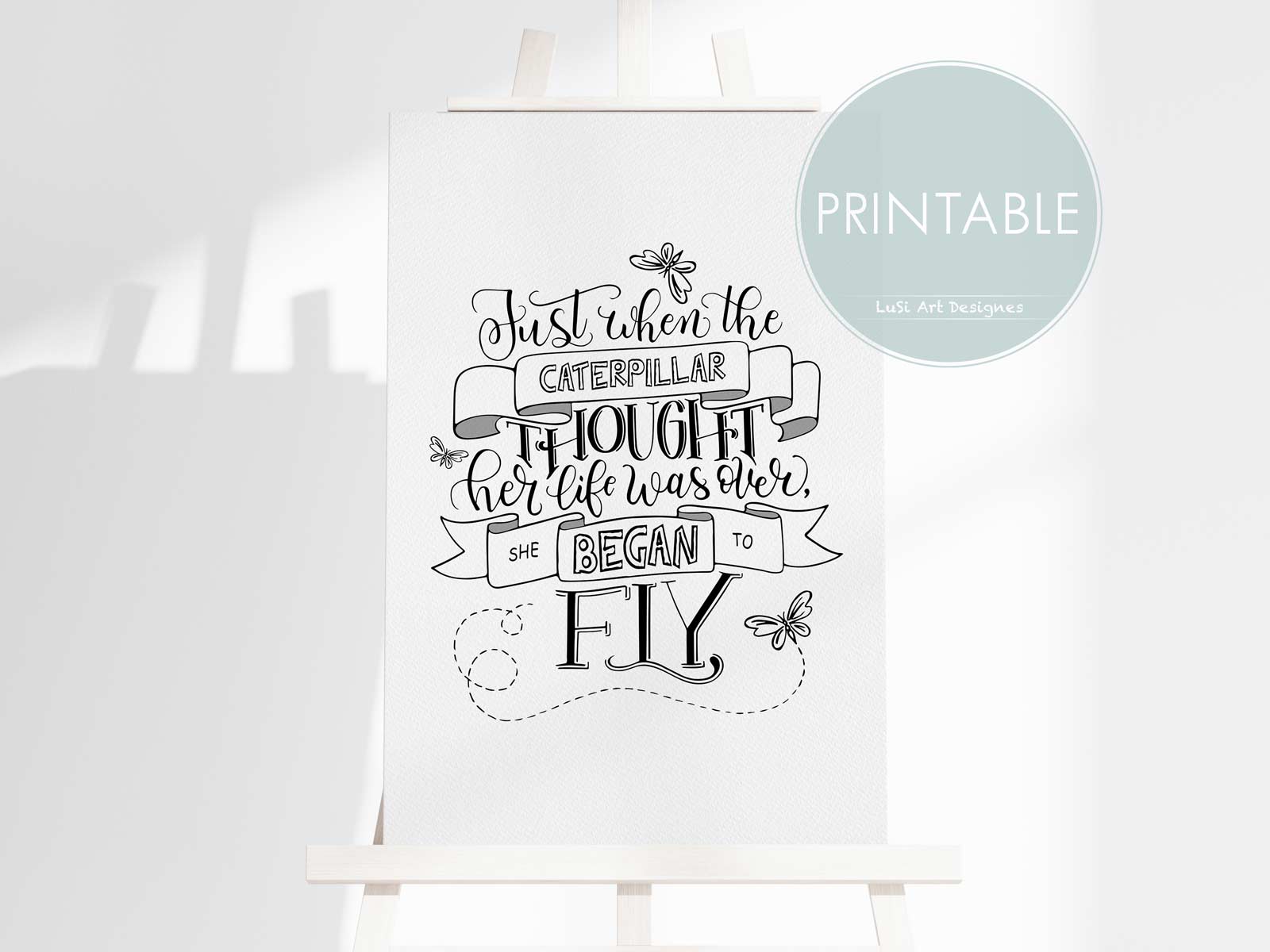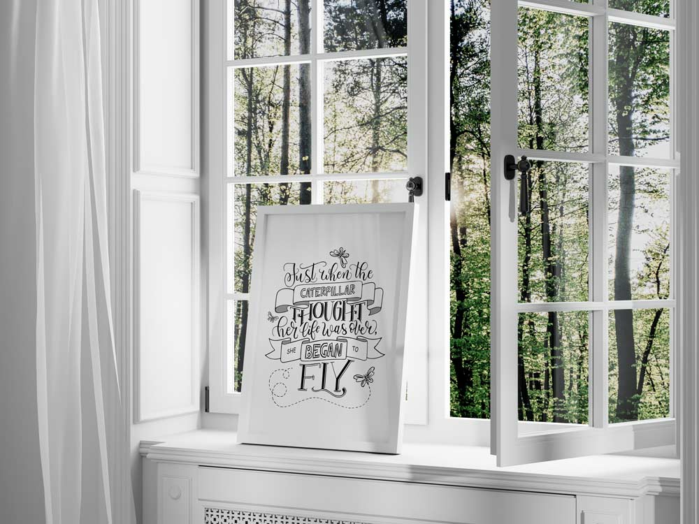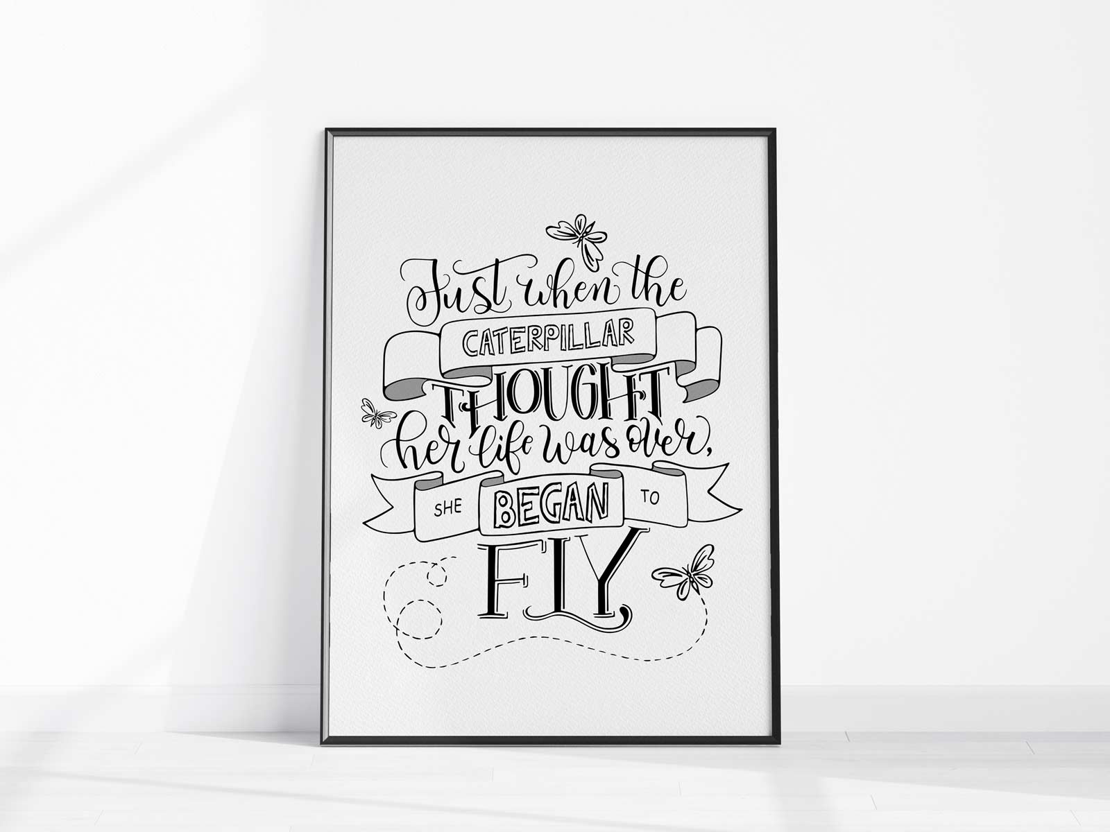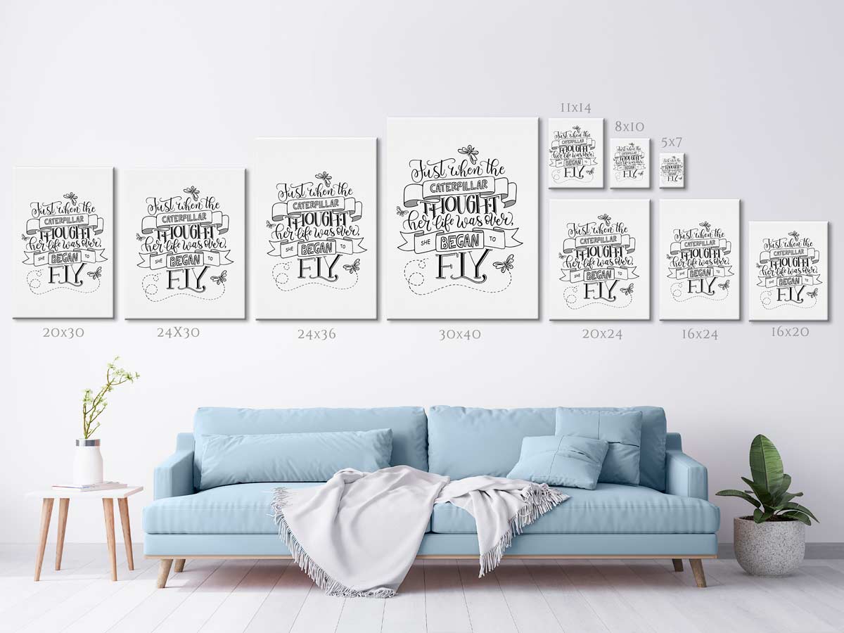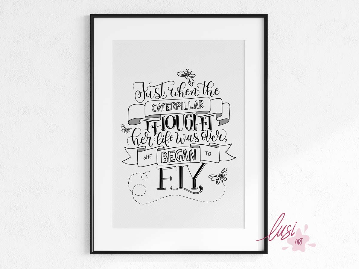 Brighten up your entryway, living room, kitchen & dining, bedroom, or office with this Handmade Modern Calligraphy Caterpillar Inspirational Quote “Just when the Caterpillar thought her live is over, she began to fly” wall art print. This black and white wall decor will bring a splash of motivation to any room. Download, print, and trim your art within minutes or send it to your local print shop.