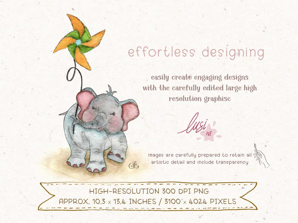 Tap into your childhood imagination and create the cutest designs with this adorable baby elephant character. I created this illustration to save you time and to help you easily create super cute whimsical projects. I hope you enjoy creating with these.