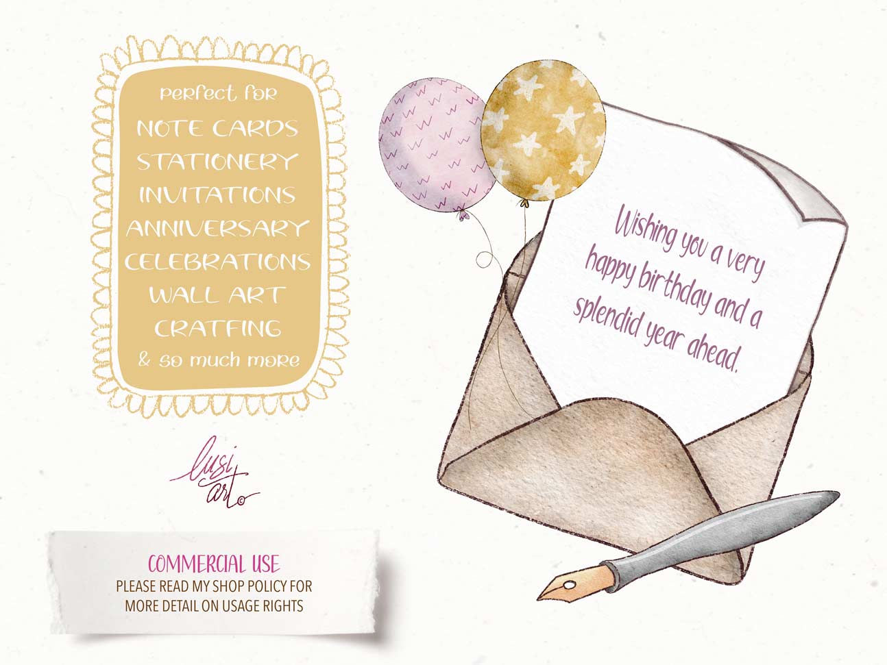 I’m sure it’s just the thing for your next cute project you have in mind. If you’ve been dreaming up the sweetest set of birthday cards, party invites, themed prints, posters, greeting cards, banners, or home decor, then this hand painted watercolor party balloons illustrations will be just perfect for you! Creating playful and sweet designs couldn’t be easier with this lovely party balloons clipart set. My signature hand drawn style will add a sweet and whimsical touch to your design projects.